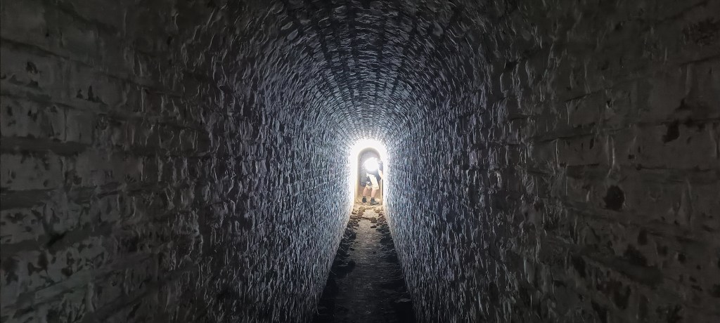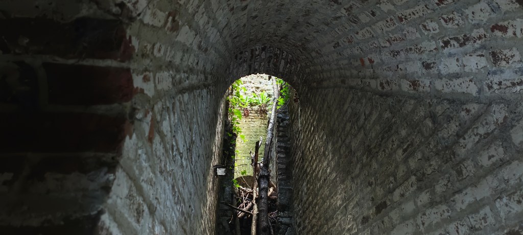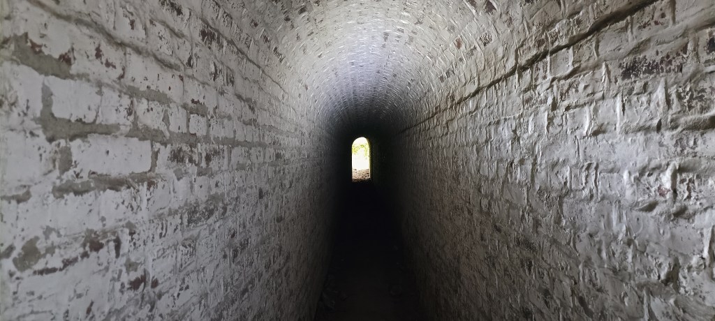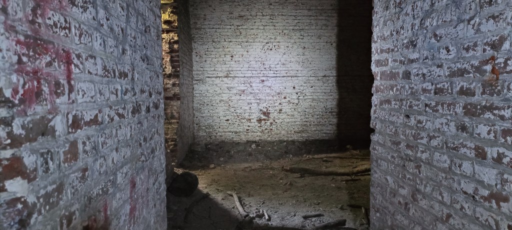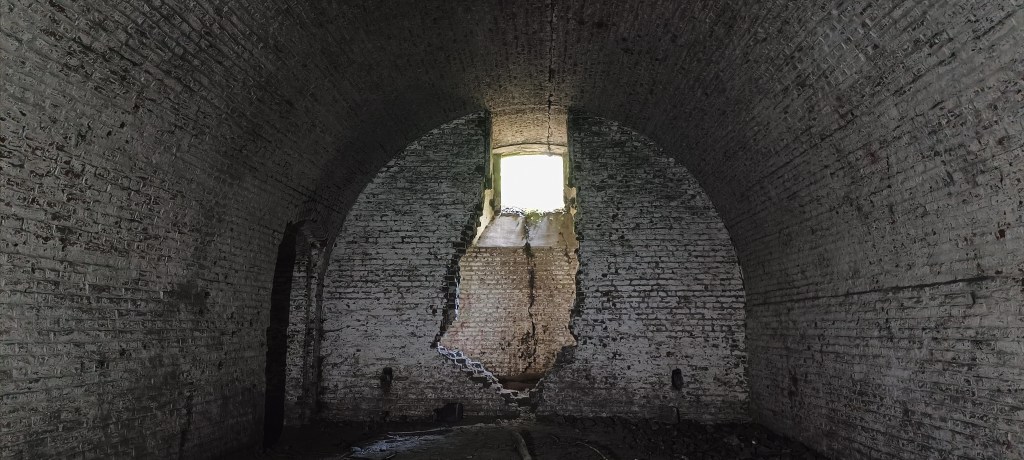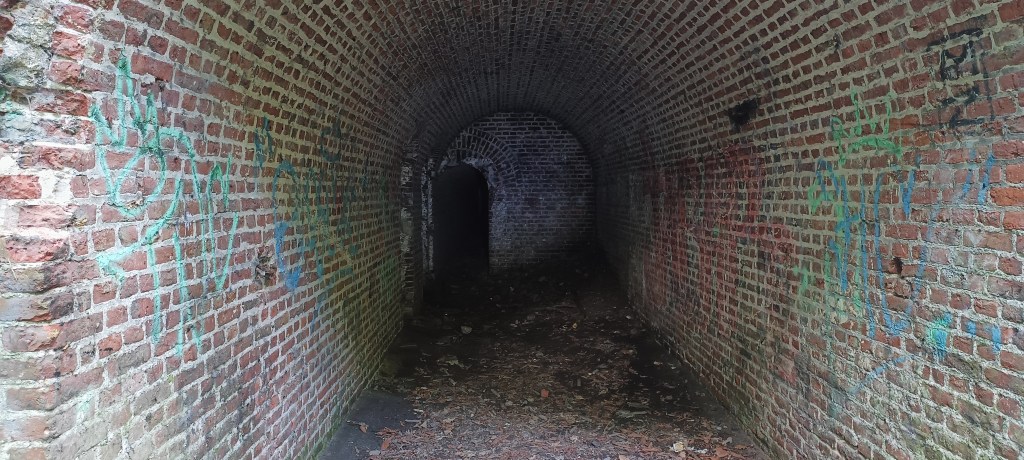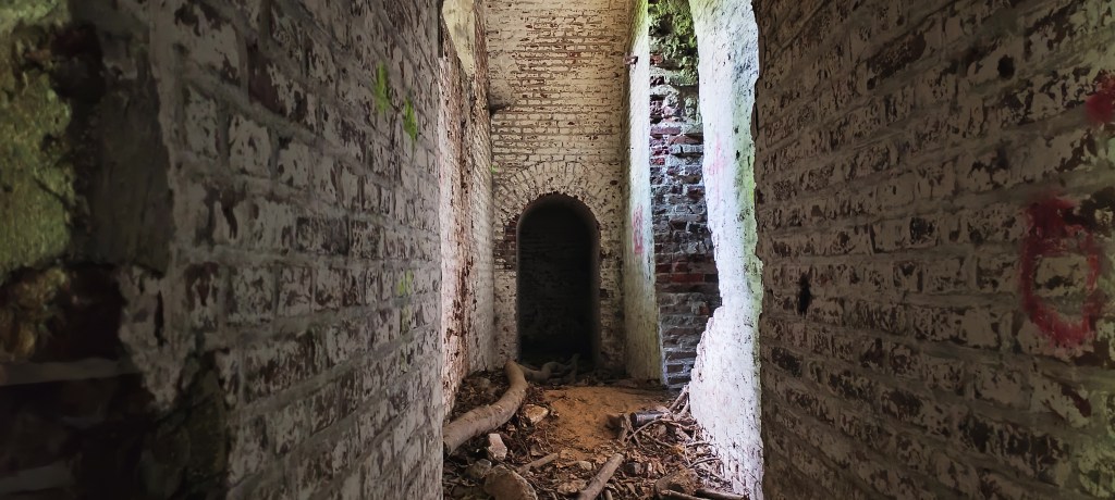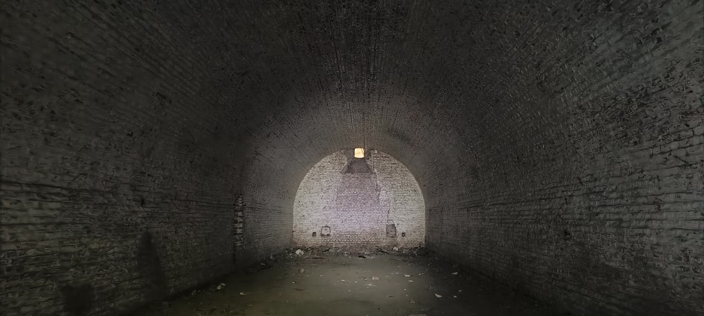 Ce petit couloir mène à l’ancienne poudrière, soit le coeur du bâtiment, qui servait à stocker les munitions, les autres pièces consistant en des séries de couloir qui en font le tour.