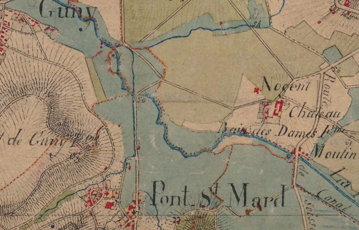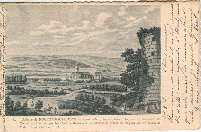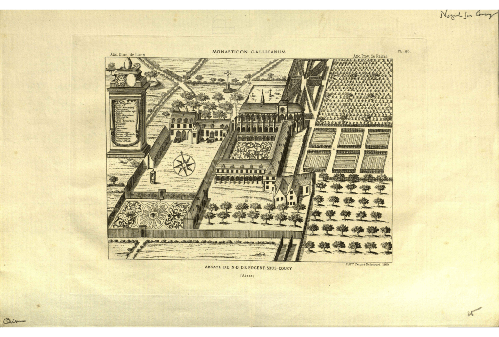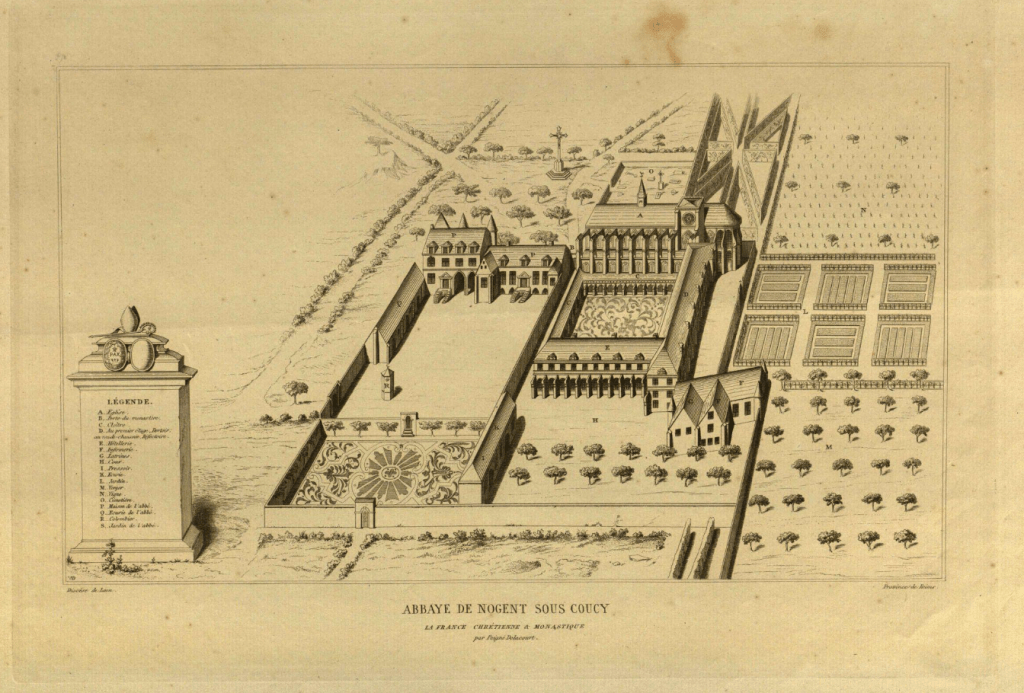 Il ne reste donc vraiment plus grand chose de l’abbaye, en fouillant sur Internet nous avons retrouvé quelques plans d’époque qui la présente telle qu’elle a pu être dans ses grandes heures, c’est toujours étonnant de voir de si grandes bâtisses être réduites à néant… Voici les plans tels que l’on peut les découvrir en cherchant dans les archives départementales de l’Aisne et un article de la Société historique de Haute-Picardie nommé « L’abbaye de Nogent et les sires de Coucy : Trois siècles de relations entre une abbaye bénédictine et de puissants barons picards (1059-1397) »