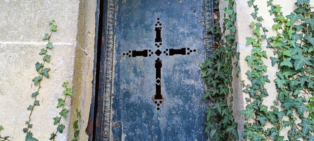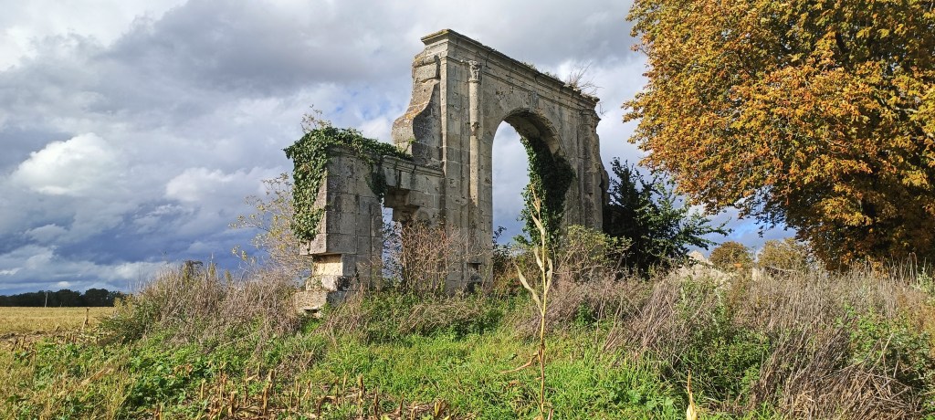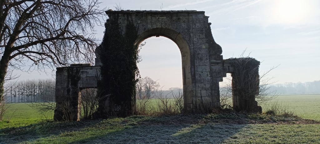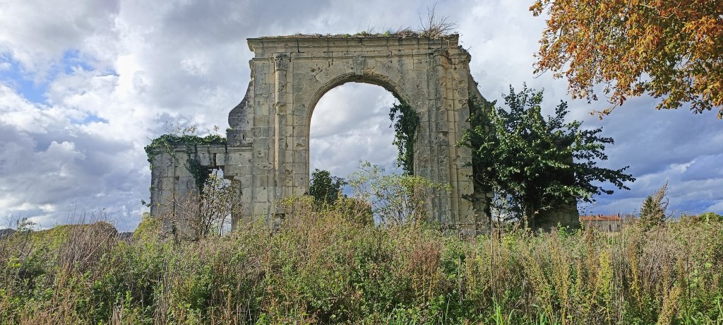 Une petite centaine de mètres après cela, nous sommes arrivés devant ce que nous trouvons être le plus beau des vestiges de l’abbaye, une des anciennes portes probablement construite ou en tout cas remaniée au XVIIIè siècle qui a miraculeusement survécu. L’édifice est vraiment impressionnant et il y a toujours cet aspect mystérieux de trouver une porte au milieu de nulle part et qui ne mène d’ailleurs plus nulle part désormais.
