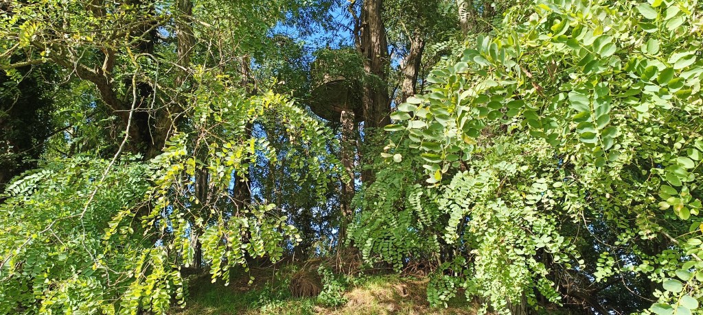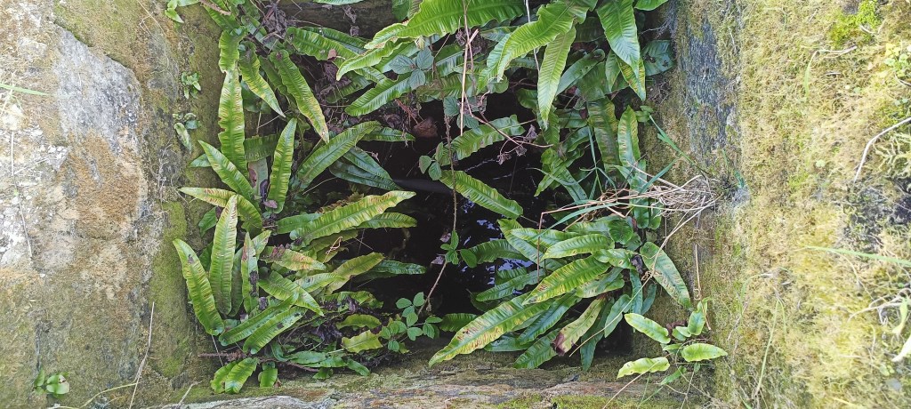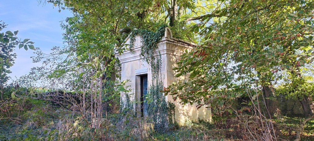 Dans le bosquet juste à côté se cache un reste de château d’eau, ou plutôt sa cuve facilement accessible, ce qui nous a valu quelques frayeurs la première fois que nous sommes tombés dessus étant donné que l’entrée donne sur un gouffre vide de plusieurs mètres de profondeur, il faut bien faire attention. Un short sur la chaîne L’Héritage de Gaya permet de bien se rendre compte du côté inquiétant du lieu.