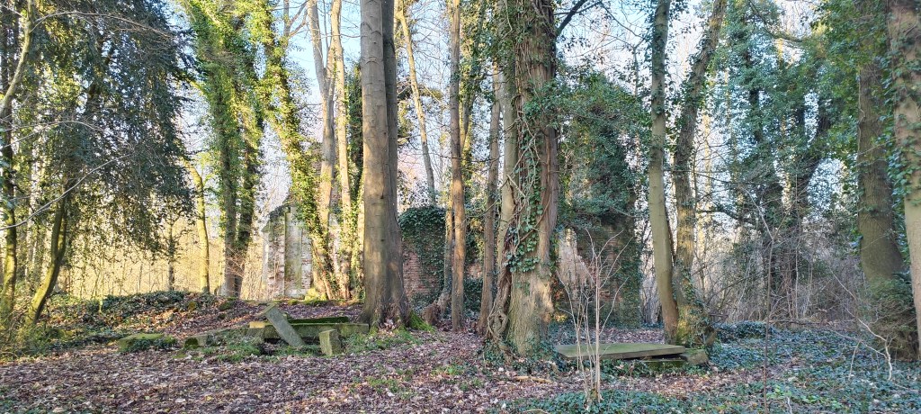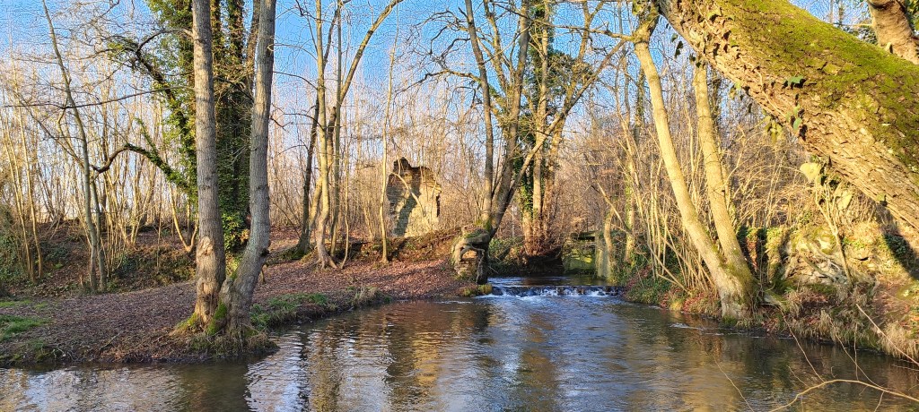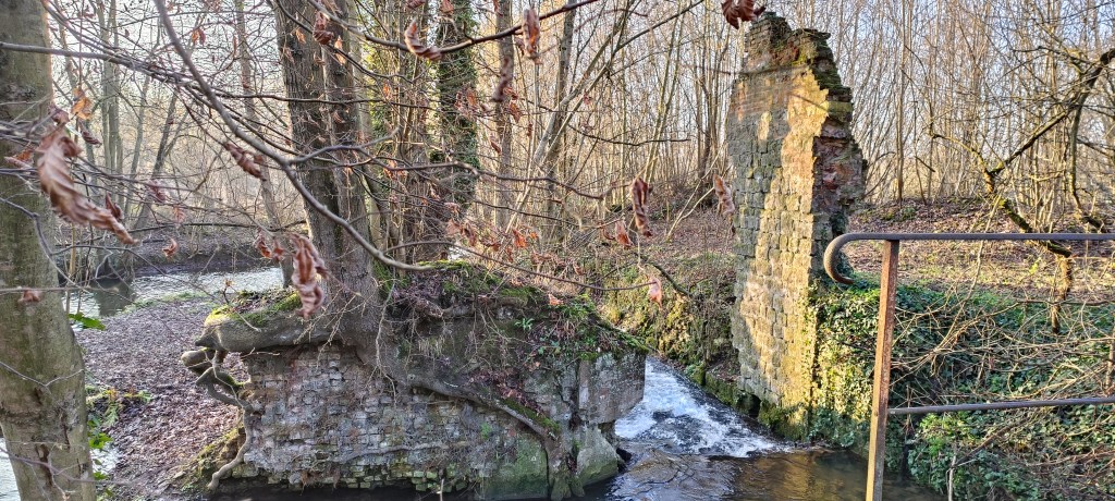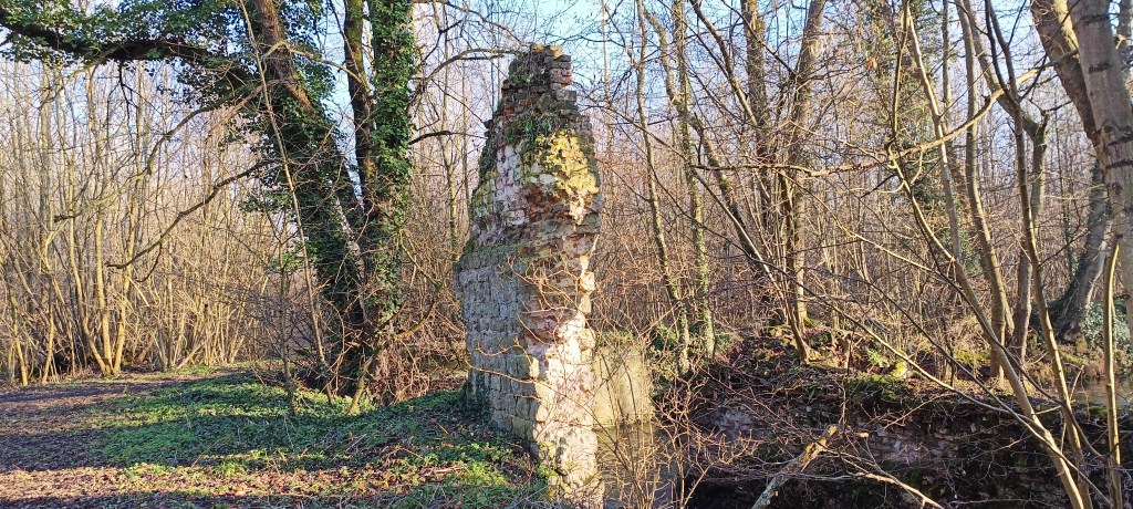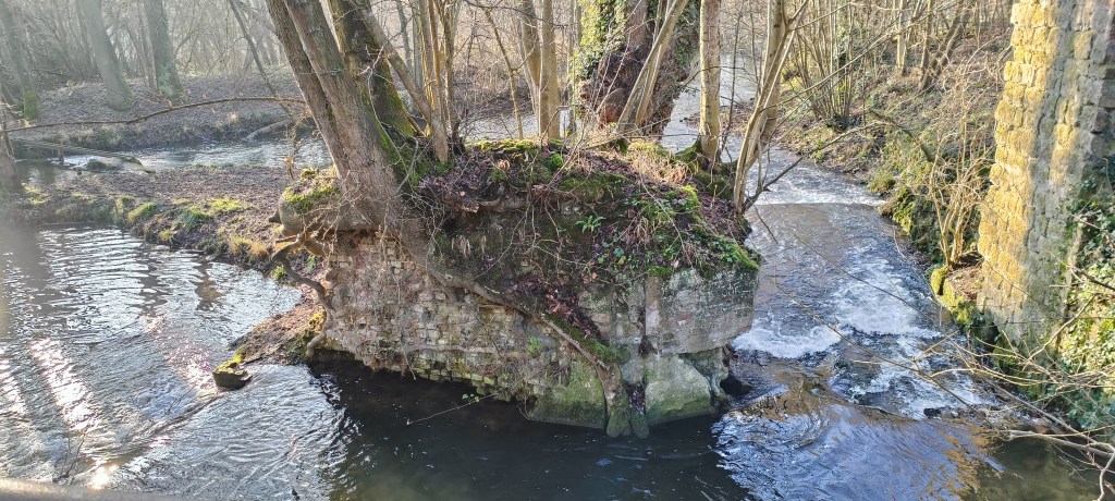 Dès l’entrée dans les bois, nous avons été surpris par ce bout de mur qui reste au bord de la petite berge, il s’agit en fait d’un reste du moulin du village. En regardant en contrebas nous avons aussi vu qu’il restait quelques vestiges de son assise.