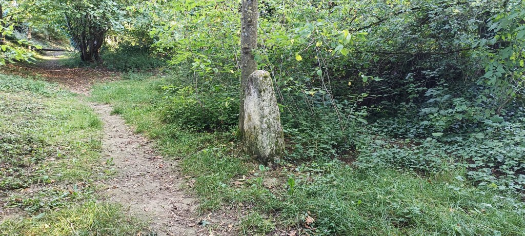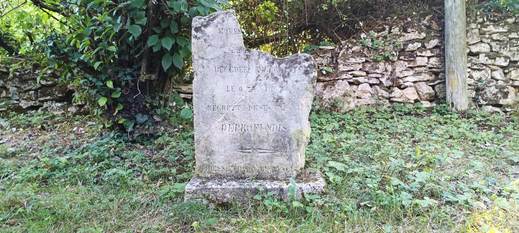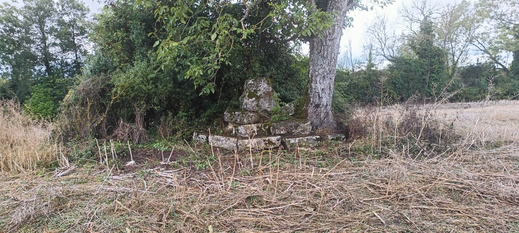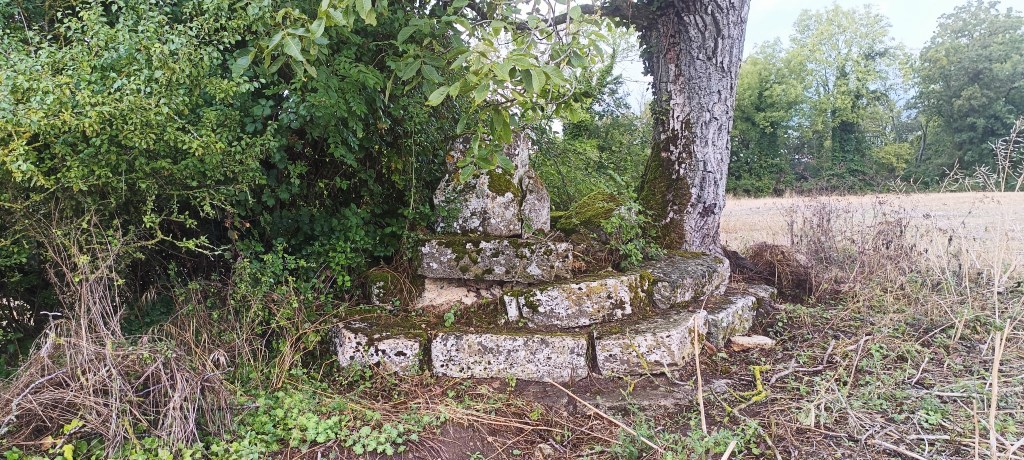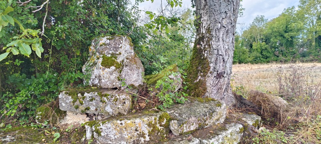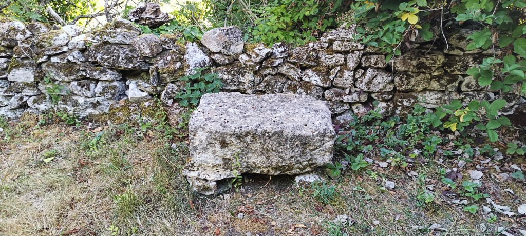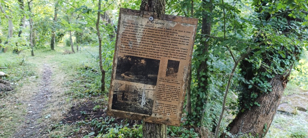 Petit arrêt près du portail où nous avons été interpelé par un amas de pierre se situant à quelques dizaines de mètres de ce dernier. Il s’agit d’un ancien calvaire visiblement plus très en forme et son rôle, d’après le descriptif sur le panneau de la carrière, « était, sous le régime féodal, de placer en franchise le chemin qui traversait la terre féodale. »