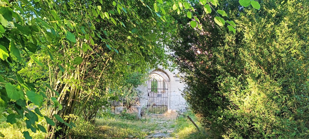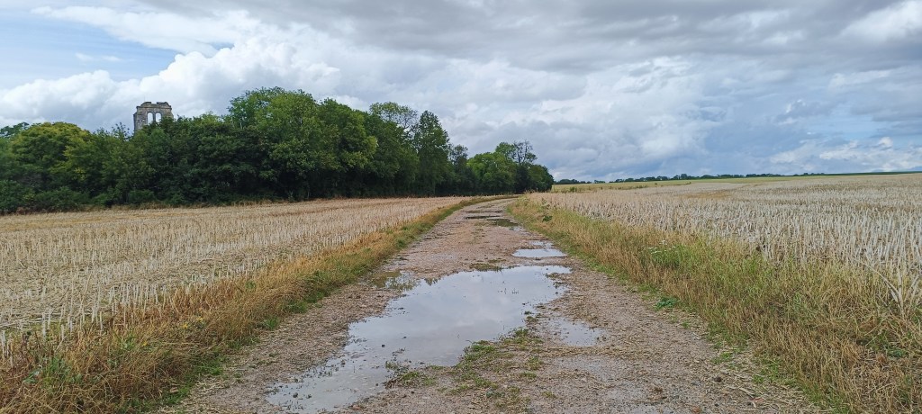 Il y a deux accès possibles pour aller devant l’église, soit en passant simplement par un chemin de terre entre deux champs ce qui nous donne l’occasion d’observer son clocher qui nous guette…