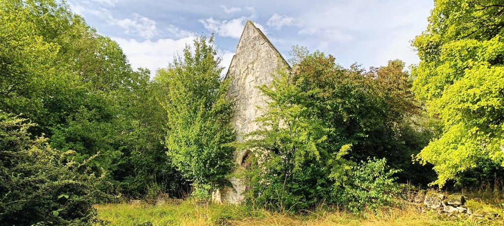 En suivant le chemin sur une centaine de mètres et être passé devant une carrière à ciel ouvert dont la pierre a été utilisée pour la construction de l’église et certaines des fondations à l’époque, nous sommes arrivés devant l’édifice en lui-même qui se dévoile d’un coup sans que nous ayons réellement pu l’apercevoir auparavant le long du chemin dans les bois.