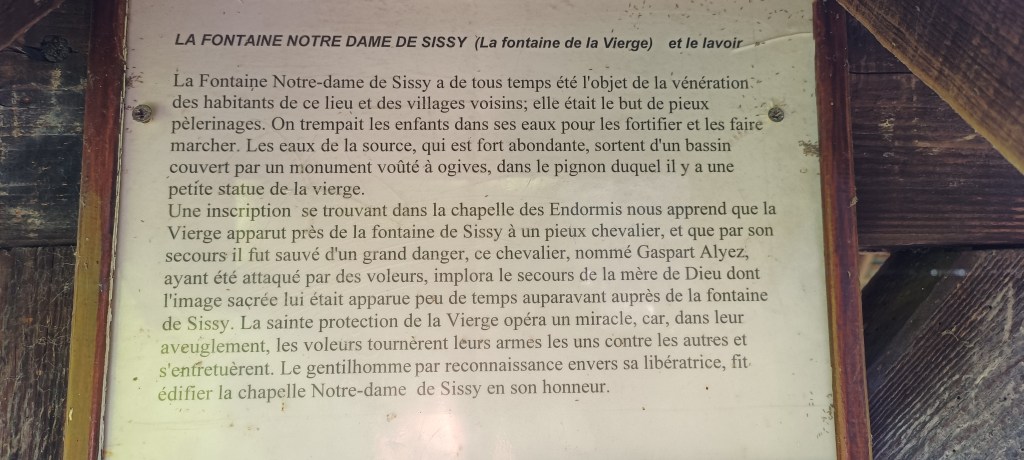 Sur un autre panneau qui commence à s’effacer avec le temps, il est précisé « [qu’on] y amenait les enfants qui tardaient à marcher, pour les y plonger ou tout au moins y tremper un ruban que l’on nouait ensuite autour des reins des bébés, qui selon les dires marchaient au bout de neuf jours. Le cordon était ensuite accroché devant la niche où se trouve la statue de la Sainte Vierge – Et l’on peut encore en voir aujourd’hui. »
