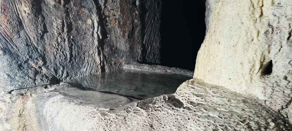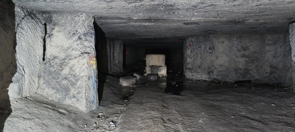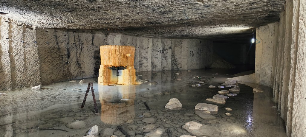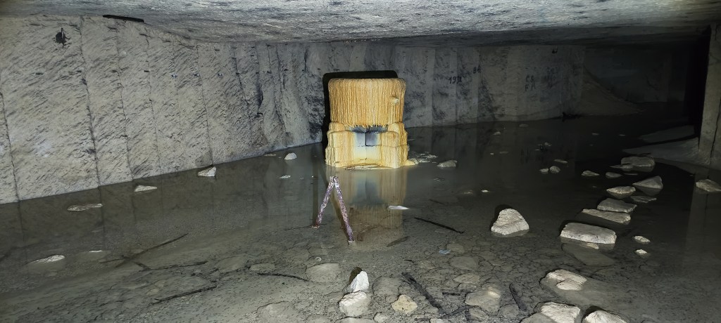 Parmi toutes les carrières que nous avons pu visiter, celle-ci se distingue nettement par son lien important avec l’eau qui s’entend quasiment dès l’entrée et qui est encore plus prégnant une fois qu’on s’enfonce un peu, là où il vaut mieux se rendre en botte. Un petit écoulement se fait entendre et il ne faut pas beaucoup de temps avant de découvrir un petit bassin dans lequel de l’eau coule au goutte-à-goutte.