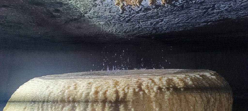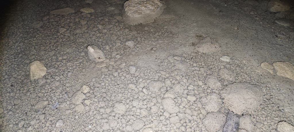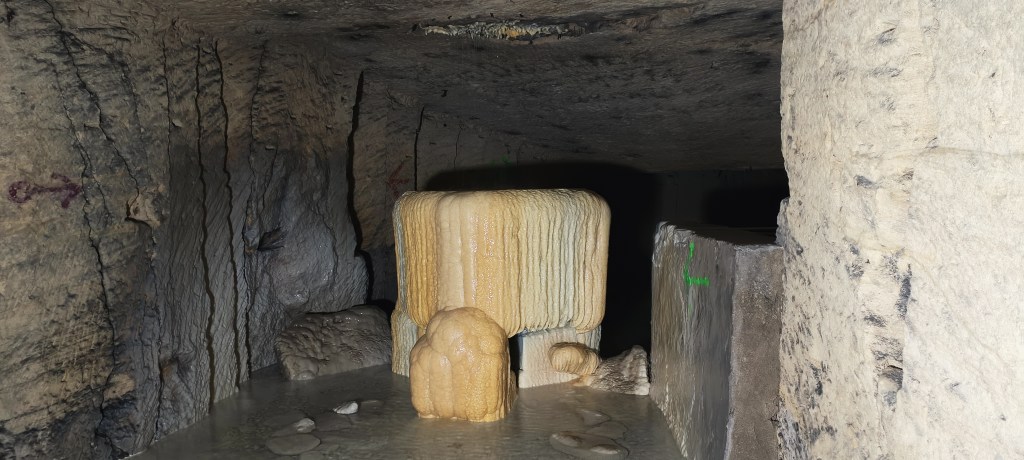 Nous n’avons d’ailleurs pas encore insisté sur le bruit de l’eau qui coule et qui résonne dans la carrière, à un tel point qu’à cet endroit il est difficile de se faire entendre convenablement. Il faut aussi faire attention lors des déplacements dans cette partie puisque le sol est jonché de perles de caverne, qui sont le résultat de la concrétion de sel calcique autour d’une particule, ce qui rend le dénivelé assez compliqué à appréhender, mais on les pardonne !