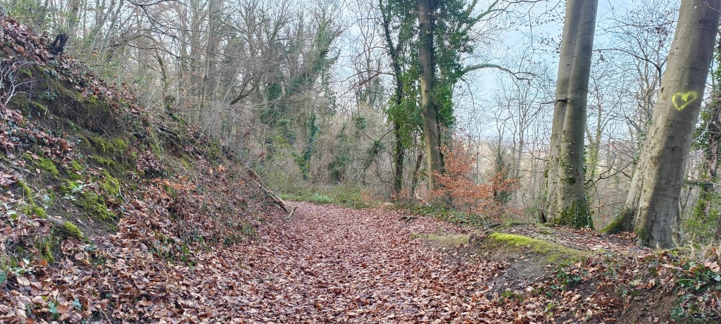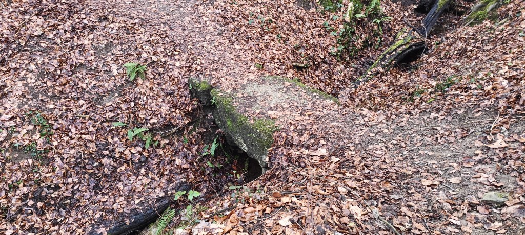 Au départ depuis la rue de la Chesnoye, il suffit de suivre quelques chemins qui finissent par mener vers le Saut du Boiteux, lieu qui possède lui-même sa légende. Il est vrai qu’un ravin comme celui-ci surprend un peu dans les environs. D’après le panneau d’interprétation posé ici il y a peu : « Il était une fois, un jour de chasse à courre, une meute de chiens qui poursuivaient un cerf boiteux. Hélas, un ruisseau surgit devant le pauvre cerf faible et fatigué. Et dans sa tête, le cerf se dit : Si je saute je vais peut-être mourir. Mais si je ne saute pas c’est sûr que je vais mourir. (En effet les chiens étaient proches) Alors il prit de l’élan et sauta. Et ouf ! Il atteignit la berge. »