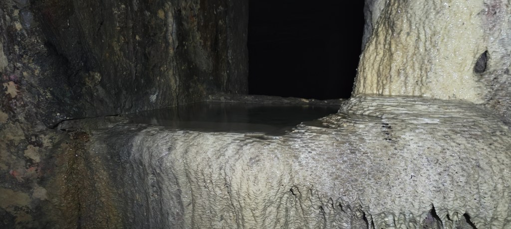 Et nous voilà devant la troisième et dernière fontaine, elle nous a semblé être celle avec le débit le plus élevé. La contourner permet de traverser un couloir qui mène au fond de la galerie, bien inondée.