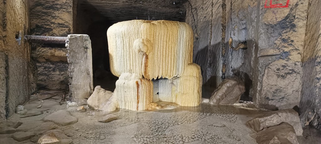 Il est maintenant temps de parler de ce qui fait la particularité de cette carrière, à savoir ses trois fontaines à concrétion calcaire, toutes situées l’une derrière l’autre dans un boyau. Elles sont basées sur une fondation de parpaing et d’une cuve dont l’origine est assez indéfinie qui a sûrement été posée par les carriers à l’époque, mais c’est ce qui fait tout leur charme.